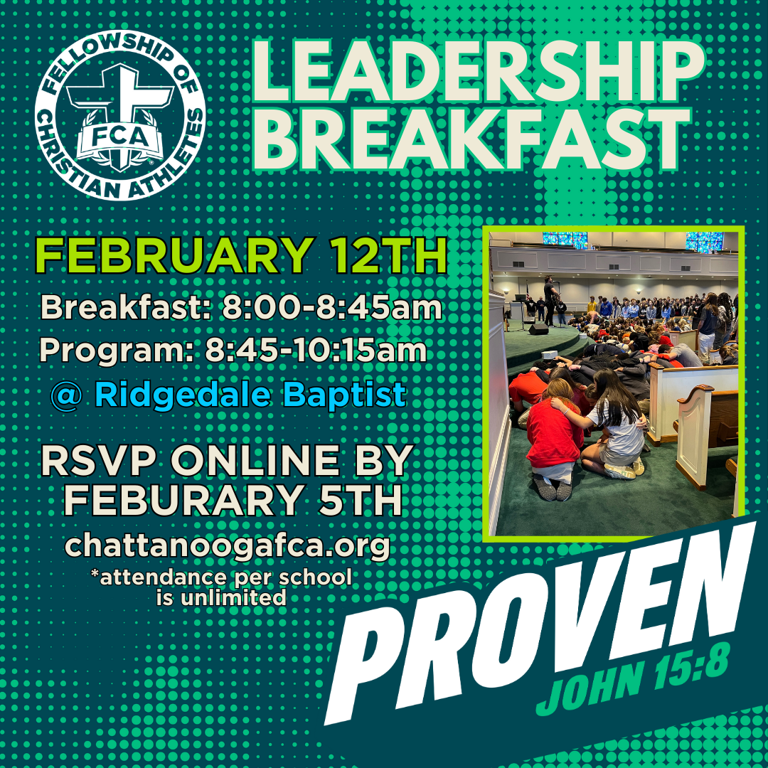 Join us for the FCA Leadership Breakfast on Thursday, February 12th at Ridgedale Baptist Church! Chick-Fil-A biscuits will be served starting at 8:00 am EST! 🥯☕️This is a wonderful opportunity to be encouraged with hundreds of other students to finish the school year STRONG for the GLORY of God!