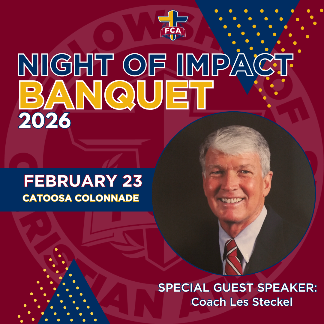 The 2026 Night of Impact will be on February 23rd at 6:30 pm at the Catoosa Colonnade with guest speaker, Les Steckel, former FCA President and NFL Coach!